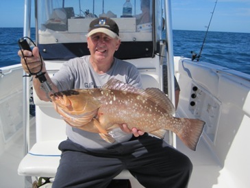 Monday, 10/25, I fished with long-time customers Chester Yanik, his son, Mark, and friend, Tom Murphey. We headed out to 65 feet, about 28 miles west of New Pass, where we fished with live shrimp. Chester caught a nice red grouper that weighed 11 pounds and measured 28 inches(see photo). It ate a jumbo shrimp. We released about 50 more red groupers that were short of keeper-size. Mark also released a big barracuda, about 40 inches long and 20 pounds. It tried to eat one of the porgies we caught. In fact, the goliaths and the 'cudas ate the biggest of the fifteen porgies we hooked, but we kept a half dozen nice ones to 15 inches. We also caught two keeper, 14-inch yellowtail snapper and fifteen keeper lane snapper to 12 inches. We released a short hogfish and small mangrove snapper.
