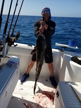 Dr. Meir Daller, his wife, Rie, their two sons, Julian and Brenden, and a friend of the boys’, Joey, fished 33 miles west of New Pass with me on Saturday. They used frozen shrimp and squid to catch a brace of 15-inch porgies, a 13-inch mangrove snapper, and a dozen good-size grunts. The winning catch was a 50-inch, 60 pound cobia, which bit on a small grunt. There were three cobia around the boat, and Meir managed to land the largest of the three (see photo below.) We also released an 8-foot sandbar shark.