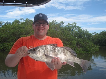 Thursday morning, 8/1, I fished southern Estero Bay’s backwaters with the Thompson family: Brian and Cynthia and their son and daughter-in-law, Tristen and Kristen. They fished a catch-and-release trip, using live shrimp, and caught a nice variety. They released a 21-inch redfish, two black drum at 15 inches and 19 inches (see photo), six sheepshead to 12 inches, a sand bream, and a 17-inch snook.