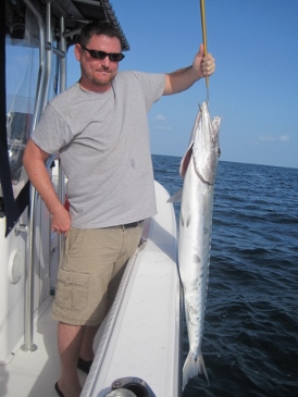 Nate Binder and his friend, Mr. Mernacki, fished offshore with me Monday morning, 7/30. There was a light drizzle when we headed out, and weather predictions were for that light rain to be mostly along the coast, and to move through the area quickly—wrong! We had rain most of the morning, and had to delay heading out to our farthest spot for a bit, since we encountered a few storms that contained lightening. We eventually got out to 25 miles, though the ride wasn’t smooth, in sometimes four-foot seas. But the guys had a good time using squid and cut-bait to box fifteen keeper lane snappers and a Spanish mackerel. They released two yellowtail shorts, six mangrove shorts, and thirty red grouper shorts to 18 inches.