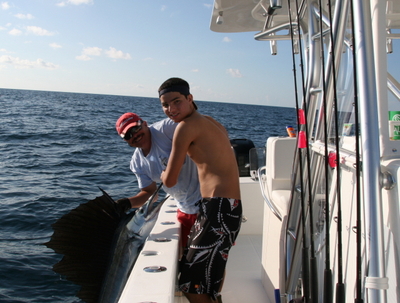 The day sword bite is definitely on! Since my last report I have fished every single day with the exception of 2 days. The vast majority of the trips have been swordfish trips, mostly daytime, some nighttime and also some combo trips. I have also done a few trips on the edge. Well the daytime bite has been very good. We caught swordfish on every single one of our trips with the exception of one trip that we got bombarded by rain and thunderstorms. But even that was OK as we had the same client the next day and the weather improved and we ended up catching 4 daytime swordfish in one day. He was so ecstatic and booked 3 more trips for next month. We have actually had quiet a few trips with 3 or better swordfish per trip and our best day was 5 swordfish. The fish have been on the smaller side and we have released the majority of our daytime fish. I have tagged at least 6 swordfish in the past week or so and released more than that. There are still some big fish around. We have had some fish close to 250 pounds and have heard of a few fish over 400 pounds being caught. Since my last report, every angler on board has manually cranked on every single one of the swordfish caught. Believe it or not, we actually had a 7 year old boy from South Carolina crank on a swordfish, and although he did have some help from his dad, he actually fought the fish the majority of the time. Now that is quite the achievement for a little boy. The evening bite has been pretty good as well. We caught three swordfish last night and also a Cuban night shark, but we also had one trip that we didn't even hook a swordfish. Every night can be different. On one of our combo trips, we fished with Mathew from England and caught a few daytime swords during the day. As we switched over to do the night set, we were letting out our first bait on a jug, when the jug stopped sliding out and the next thing we saw was the LP light racing on the surface followed by a few spectacular jumps from a 200 pound plus broadbill. Mind you, that this happened while the sun was still out and it was just starting to get a bit darker. It was quite the scene. We ended up pulling the hook on that fish after 20 minutes or so, but that was OK too, since we caught 3 more swordfish that night.