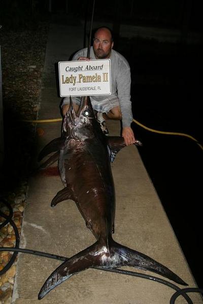 We all called it a 100 lb'er until the 212 lb'er was in the boat. Gear went back out immediately; we were ready to get our hands on another Broadbill. Our last fish of the night was a 45 incher that swam away a free man for a future fight.
