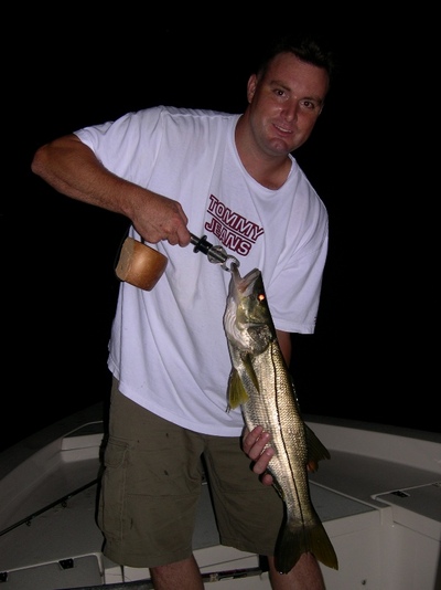 Night time continues to be the right time for snook. The snook bite after dark has been super all summer long with most trips being very productive. At the end of the day its still fishing and not all trips go as planned. Last night went as planned, snook and a host of others were eager to play. Early this summer I wrote how we used small weights more often and increased our redfish, snapper and grouper catch from the very same docks and bridges. At any one time we would have a bait fly lined, one at a middle depth and one hugging the bottom. Typical water depth 8-10'.
