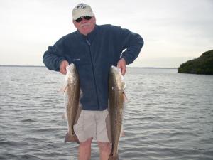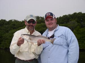 The next day the wind changed directions and the snook left but we had more reds in one big school.. Fishing with me were Mike Dressel and brother Don Dressel and good friend Wally Garde. Using live shrimp this team of fishermen caught and released over 40 reds ranging from 15" to 34". It was quite a day of fishing with strong NE winds blowing all the water off the flat except one large pot that had the reds trapped in.