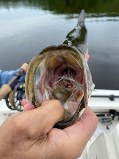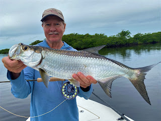 Day three with Mike and the man is on fire! We were back in Homestead with perfect conditions (which included over cast skies and zero wind) and off we went to fish for bonefish. The bonefishing on the outgoing tide was surprisingly slow with only a few schools showing up for our sight seeing pleasure. With that slow I took Mike to a creek I like for snook and as soon as we got there we see a tarpon roll. Nice! I set up Mike with a good angle to cast to the tarpon and he made a few pinpoint casts until the fish saw his fly. Then, a silver flash, the line comes tight and there's tarpon 3' in the air. Yes! After a bunch of jumps and some give and take Mike had his first tarpon in the boat. Not long after another tarpon rolls and the process repeats itself except this time the tarpon won after the 4th jump. Once the incoming tide started the bonefish and tarpon started to move but it was tough getting a fly to them as they were either just out of casting distance or staying deep and they would blow out as we moved over them. But, Mike did get some shots at another tarpon that ate twice but missed getting hooked twice. That's tarpon for you!