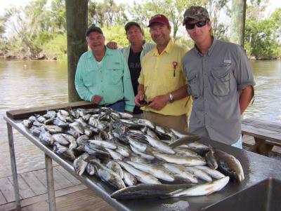 Charlie, Mike, Chuck, and Justin Miramon just had a perfect day Monday morning. Charlie has had some rough weather days this summer but it finally fell right together this morning. Team Miramon was definitely up to the task at hand. First stop put about 25 in the boat and the wind eased up so out to the rigs in Breton Sound Next stop was all it took. A little boat repositioning and it was on. The trout were up top in 8 ft of water they wanted the live shrimp and plastic's under corks 3 ft deep. By 10:00 the limit was filled. We stopped and caught 2 reds on the way in and released the big one and Mike kept the smaller one for the grill. Great day I am glad this crew finally got some good weather and it turned into box full of nice trout.