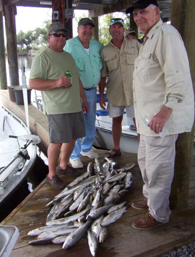 Sept 6, 2007 - Charlie, Sam, Keith and Emanuel were back again and ready for some more trout fishing action. Charlie told me first thing this morning he wanted nothing but big trout no schoolies today. The bay was quite choppy but my 25 ft Team Avenger made for a comfortable dry ride out to the rigs. First stop there was a boat right where I wanted to be so we fished all around being careful not to infringe on these guy's and caught a few but moved on. Second stop first cast CUZ! Emanuel Dugas puts a big trout in the boat. It was on for while but we missing a lot of bites with the wind except for Charlie he was giving us lessons on how to catch'em. The rest of the guy's caught on and boxed a bunch before the bite quit. Further out we went hopping from rig to rig picking off a few at each. Got on one more good bite around 11:00 on a small wellhead with solid 2 to 3 lb trout to finish off the day. All fish caught in live shrimp 3 ft under corks and Carolina rigs. Not a full limit but a box full of quality trout, just what Charlie ordered.