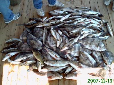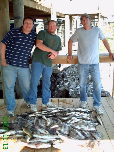 Terrific Tuesday on the Beach. My guests for the day were Andy Stebbins, Matt Volpe, and Aaron Sharky. The weather was perfect, but little tide movement. At our first stop we got on a good Trout bite with Campo's live shrimp under a cork. The bite faded out after putting 50 or so on ice. We made a couple of more moves and got on some good action both under the cork and on the bottom. The guys had a great time and filled up the fish box to the top and then some. Total for the day was 100 Trout, 17 Sheepshead, 8 Drum, 3 Reds, and 1 Bass (had about 12 others we released).