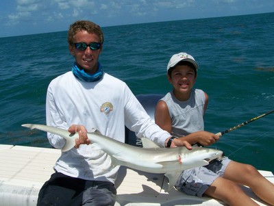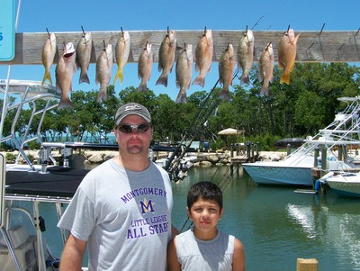 Ten year old Justin Garza loves fishing with his stepdad Eddie Thomas at home in Montgomery TX. While on their first vacation to the Florida Keys, they shared a fishing adventure with Capt. Chris Johnson of SeaSquared Charters out of 7 Mile Marina. Eddie requested an offshore trip but, due to bumpy conditions on the Atlantic, Capt. Chris opted for fishing the calm waters of Florida Bay. They went to a wreck 16 miles out and found lots of action. They caught their limit of mangrove snapper, a couple of yellowtails and a bonus dog snapper. Just for the sport of it, they caught and released goliath grouper along with a bunch of sharp nose sharks. Justin was pleased to outfish Eddie to provide tasty snapper filets the family enjoyed at Castaway Restaurant in Marathon. Back at the dock, he proclaimed it was much more fun than bass fishing in Texas!