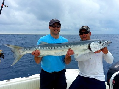 By now we are into overtime and I asked Brian if he was ready to call it a day. He looked at me and asked if he could extend the trip to a full day. No, we hate fishing and want to go home… OF COURSE! We were hoping to end the day with a bang (sailfish). We're in a good spot for the "witching hour" when, Ba-Boom, the down rod sounds off and it is a strong fish. Brian fights this fish for some time and we are thinking, shark. The fight dragged on for many long agonizing minutes and he just can't stop the fish from reaching the bottom structure. The line goes limp. Oh well, that does happen when fishing light tackle. We got back into gear and mere minutes pass when he gets into a Blackfin. No sooner do we get that fish to the boat when one of the other lines takes a hit. Yes sir! I think we have his brother! Sure enough. Brian is getting a workout but happier than a clam on muddy bottom. He brings the fish to boatside where Blackie meets Devon and the steel. Nice!