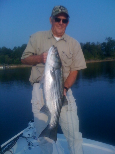 It's been a pretty good week, even with the hot weather we've boated some good fish this week. That continued this morning. I had three guys on the boat today, all from Alabama. They stated that they did a lot of fishing on the coast, but not much stripe fishing. So we loaded up at Ryan Creek Marina and headed south. We started with 2 different umbrella rigs. Both had bucktail jigs with just a little different color pattern on each. As we got to our first spot, we set our lines out and I started working an area that paid off on Tuesday and Wednesday. But today was not Tuesday or Wednesday, it was Thursday and the fish had moved. I kept working the area trying to track them down, but with no luck it was time to move. Right across from the area we were fishing, there were a number of points and humps. So I drove us across the lake real quick to get a look. After running a 120 yard stretch and looking at my depth finder, I knew we had found what we were looking for. So we putted north and turned around. It didn't take long...on our first pass we hooked up. It was small, but at least it was what we were looking for. Every pass after that we hooked up, with every fish getting bigger. Our last fish on that spot weighed just over 20 lbs. After that we got some swats but no commitments. By that time it was 8:30 and the bite had changed. I told the guys that I felt our window had closed. We picked up another small stripe and a bass on two other spots. Today was another good day, just wish it was a little cooler so the bite would extend longer. All our fish were caught in depths from 20-30 feet.