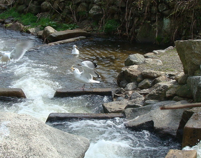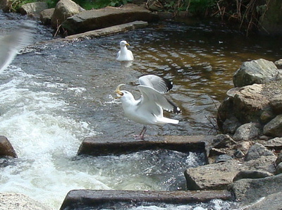 I made it up to the Brewster Herring Run at the right time today. The town has been working on it, putting in new walkways and cleaning it up so you couldn't park during the week. I caught a seagull gorging himself or herself on a big fat one. In the picture with this report you can see the tail sticking out of his mouth.