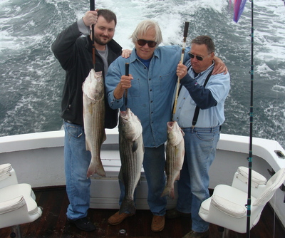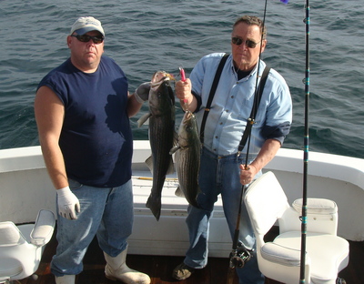 For the last two weeks those of us fishing Cape Cod Bay have been able to count on one thing. That the striped bass could be found in one specific area. Every day you can set a course to a larger area northwest of the #1 can which is on the southwest corner of Billingsgate Shoals. Once in this area put out either single swimming plugs, hootchies, or the more productive system, the umbrella rig. It will not take long before you are hooked up. They aren't super big. Some of these fish are over 40 inches but most are from 30 to 34 inches in length. Real good bass fishing.
