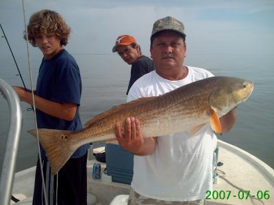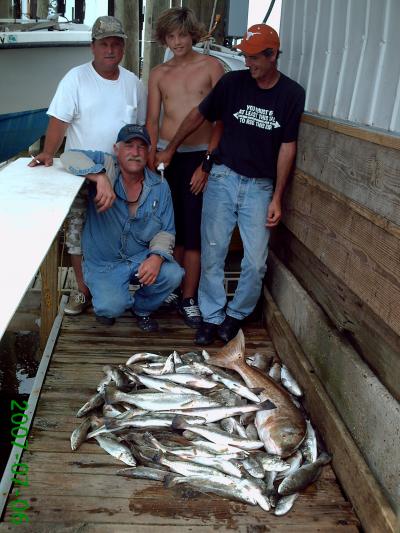 The beach is still red hot. And it was hot and still Friday. I had a great bunch of guys on board Friday, Keith Trosclair, Dave Fleming, Collin Ledet, and Jimmy Guidrouz. These guys are good fishermen that fish a lot, but just not in the Shell Beach. With all of our good reports they had to give it a try. Armed with Campo's live shrimp and croakers we headed to the Sound. Our first stop at a small well head produced some fast action and Trout were hitting the box fast. The water and air were dead still and so was our bite before long. To tell you how still it was when I went to undo the rig hook it was not even on the rig anymore. It had fallen off at some point and we never moved. We made a few more stops looking for some moving water and picked up fish at each and the guys put together a pretty box of fish. Total for the day was 85 Trout, 6 Sheepshead, and 1 Red.
