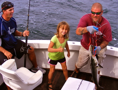 This last Monday Capt. Steve Ellis, of the Watanye, had Joseph Parsons and his family out on a half day trip. Capt. Ellis had a notion that there were some bluefish up north of the Path out in the lobster pots. He set out his hootchies once he got there and within minutes he had two fish on. It continued that way for the whole trip. On Sunday I had the Fordyce crew out. The main players were Parker Kylie, Kayla, and Jillian. Ranging in ages from 6 to 11 years of age. These four young girls caught most of the fish with Kayla, who is 7 1/2, landing the biggest one.