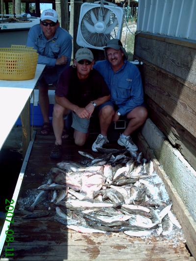 The fishing was hot Saturday on the Beach. Saturday was day two for the Bill Chamblee group from Dallas. Three of the group jumped on in and after a stop by Campo's for their famous live shrimp we went back to where we hammered the Trout the day before. Fishing under a cork things started off slow, but the action picked up as the sun came up. There were more throw backs than the day before, but the keepers were very nice. It was a day of constant action, a lot of fun, and limits for all. Same thing for the rest of the crew that was with Capt. Frank, they limited out early. Total catch for the day was 100 Trout, 5 Sheepshead, 3 Flounder, 20 Channels, and 3 big Reds that were released.