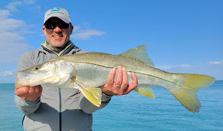 When Rick booked me he let me know he lived in Miami so when I was watching the weather for today I didn't like the wind, lots of wind so I asked him if he wanted to reschedule. The problem was his buddy was leaving Monday back home so we went for it. It was not ideal for tarpon and the wind was limiting where we could fish. Hmm, OK no problem, we'll work through it. I looked for tarpon everywhere to no avail so we turned our attention to snook and bonefish. After the only bonefish spot we could fish drew a blank it was time to search for snook. Ha, Rick found them. After a few casts he hooked a solid snook and proceeded to land another one after that. His buddy Gus hooked one but it came off next to the boat and the guys missed a few more bites but the rods stayed bent with snappers, jacks and more for Gus and Rick. Wow, Rick rocked the snook!