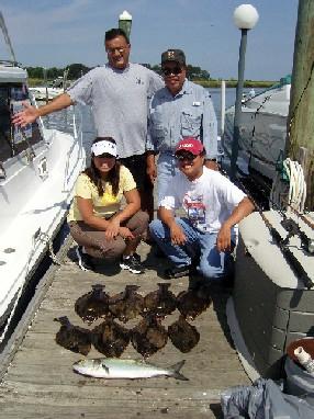 Today we had out the Jhanj family, Mel his son Jhan, daughter Sofia and last but not least his son in law Eric. After trying all over yesterday I stayed local today and it paid off. The group caught 8 keepers 2 @ 17-18"s 6 between 3.5 and 5.2 pounds they also caught atleast 20 throw backs half just missed the cut line. Blues made a brief run through there were peanuts everywhere.