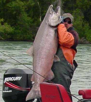 Tim Berg's Head-Kenai River guide Greg Martin hoist's up a Record Class 74 Pound Kenai River King Salmon that was caught on July 2. Angler Mark Jenson of Utah nailed the big fish on an orange cheater using "Nate's Baits Special Egg Cure" while fishing near the Pillars.