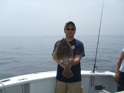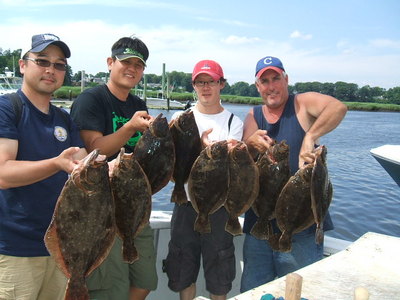 we left the dock this morning in fog on board was kenny oh and friends oj kwon and steve han, headed to the reach where the fishing was slow for the first two hours, changed our locations several times and started to pick away at the fluke, kenny was high hook with a nice flattie that weighted 5.5 lbs some shorts but also 11 quality keepers as well were boated by this very nice bunch of anglers, capt Joe.