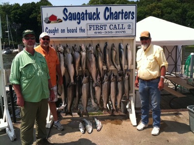 The Kings have shown up in Saugatuck. What a difference from the first part of the week to the weekend with creels containing more and more Chinook salmon each day. We started the week with very cold water and catches consisting of mainly Lake Trout but a few salmon and steelhead in the mix. By the weekend the catches consisted of limit catches of Chinook salmon and Steelhead and an occasional Lake Trout mixed in. On Saturday, our group from Louisville, Ky. Caught 25 fish of which only 3 were Lake Trout. That group, (fishing 3 days) took over 400 pounds of fillets back to Louisville to feed the friends and families.