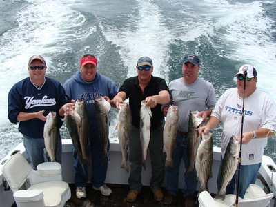 The morning of the 14th of May started out cloudy and raw with a brisk WSW wind. I had the Gilbride party, Dave Smith, Pete Davenport, Vin Zackes, Jim Jagemann, and Justin Gilbride, aboard the Stunmai II sailing out of Rock Harbor. I headed up to the south edge of Billingsgate Shoals and set out swimming plugs in the outriggers and umbrella rigs on wire off the stern. It didn't take long before we had a fish on. The first fish of the day was a 29 inch striper. A good start. Then another fish which was a short, then another and another and another. Some keepers, some were shorts, but all were fish and there was plenty of action.