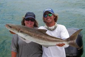 On a few of my recent chartes I have been spoiling my clients with tons of Redfish, Seatrout, and Cobia. Jay and Nancy Allen of Leesburg, Florida fish three times a month with me and during there recent stay in May they were spoiled with a variety of fish and fishing opportunities for their week. Day one we pursued Cobia and Grouper along some of the local area structure. The first spot we hit we had 8 Cobia hook-ups only landing 4, but one was a keeper. The other 4 that got away were estimated at 50lbs+. Besides the Cobia we also managed to land a few dozen Spanish Mackerel and a couple of Grouper. Day two was a little trickier as we decided to pursue Redfish with a 25 mph west wind. Needless to say these are not the best conditions but we did managed to land a dozen or so ranging from 22-27 inches. Day 3 was just a successful as the 2 days prior only this time we decided to pursue Seatrout but instead were rewarded with a school of bluefish and grouper. In two feet of water it is a true sight to see when you have over 40-50 blues chasing your spoon only to have a huge grouper come completely out of the water and inhale your bait and bluefish.