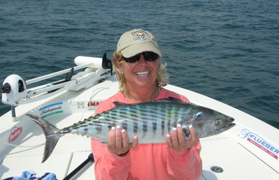 I'm seeing Bonita, Blues and a few Spanish when we are trolling off the beach to five miles off. Trolling Clark spoons and small deep driver lures has been the key to success. When using the Clark spoons, I would recommend the pink flash spoon in sizes #00, #0 and #1; the pink flash series has really helped me put more fish in the boat. A bird rig on top with a Clark spoon about five to six feet behind it or Blue water Candy Spanish daisy chain (blue, silver, pink) have worked very well on top too. Look for birds working or marking bait on you fish finder is the way to find the feeding fish. When the fish are not on top, I've caught some nice Blues and a few Bonita by casting a spoon out and letting it sink down before reeling is in. I've found that some times these fish are deeper and you can get them by getting down to deeper water.