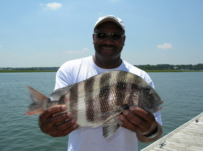 One of my favorites when the water and air gets hot is the good'ole Sheephead! These fish are fun to catch and there really good to eat! It's not hard to catch Sheephead, you just have got to put your time in and give it a try! Rigging is easy for Sheephead; we use a short carolina rig with forty pound mono or fluorocarbon leader about eight to ten inches long. The hook is a number one or 1/0 live bait nose hook; small, sharp and strong, very important for Sheephead! Look for Sheephead around pilings, bulkheads and large oyster rocks that stay covered up by water most of the tide. For bait, we catch fiddler crabs on mud banks on the ICW. Drop it down and check your bait in one minute, if it's gone and you did not feel a bite; there is a Sheephead down there! Good luck!