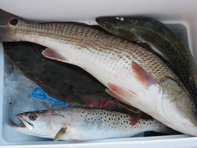 Now that I am back, I took Dave and Greg out on Friday to do a little inshore fishing. The morning was slow, but as the wind laid down and the tide started to fall, the bite turned on. We ended up catching a couple of Flounder, over a dozen redfish and a half dozen or so Speckled Trout. A great way to celebrate being back in NC waters. Most fish were caught on a white Gulp shrimp on a 1/4oz jighead.