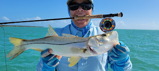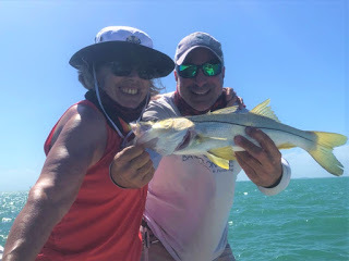 My afternoon trip was definitely incredible. I had regular client Maria and her friend Cory. Cory recently got over a major health issue and it was an honor to have her aboard to enjoy an afternoon on the water. Maria is a a fly angler and a good one but I still tried to keep her out of the 20 MPH winds. When that didn't work I had no choice but to put her in the teeth of the wind. But, Maria is awesome and didn't flinch continuing to make pin point accurate casts. My goal was to get Maria a snook on fly but it wouldn't be easy with the wind, dirty water and well, it's snook. The first three casts I made for Cory on bait got bites and the third one stuck allowing Cory to catch her first snook. I stopped and let the spot rest for Maria. I proved tough. Finally Maria hooked a few hard fighting jacks and the pressure subsided a bit. Maria then tells me she knows me well and knew I felt a huge relief. She was right! As the fish on fly started to get good she sets on a good fish and a nice fight later a snook comes to the side of the boat. YES!!! I uttered words I shouldn't and once we got it in the landing net there were many screams, hugs, more screams, high fives and more hugs. This was awesome! Mission accomplished! I can sleep tonight!