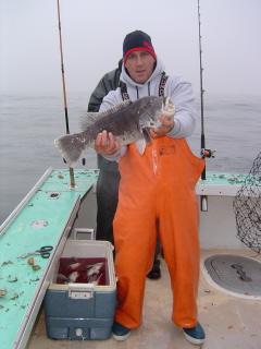 Joe and his guys (5)were out today along with Victor. fishing was much better than yesterday, with the guys landing 39 keeper tog and a bunch of shorts. Joe was the pool winner and HH with 9 Tog to 9lbs he also had a few in the 6 to 8 lb range. Vic. had 6 Keepers to 6lbs Everyone else in the group had between 3 and 4 Keepers . With Capt. John landing the rest . While it did drizzle most of the day the wind held off and conditions were ok. Whites and Greens both produced and there was at least some life in all the areas we fished.