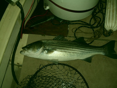 Started fishing at 6:00 friday night. I caught about 12 herring and head north. First pitch I Drift a herring and pick up a 33 inch bass instantly, drifted the strecth one more time no pick ups. I anchored up in one of the main slots and live lined and chunked. With in 10 minutes I picked up a 31 inch bass. I move about 50 yards towards jersey and acnhored again. Fished about 25 minutes and l picked up one bass on a chunk it ended up being a fat 30 inch hybrid bass, my first to date. Move once agian back towards the center, the sun was down and the bite got hot. I put out three rods, one live and two chunk baits. The herring got no hits but the chunks baits were get torn up. I caught 6 fish on chunk bait in the time span of about an hour and half. The 6 fish consisted of a 36 incher that ran like a freight train, a 33 incher, two 31 inchers, a 30 incher, and a whopper that measure 19 inches. It was a perfect night for fishing at Trenton everything came together. The perfect tide, weather, and a great Striper bite. I don't know how long the bass and herring will stay at Trenton but if want to get out on the bite Give Me a call 215 840 3093