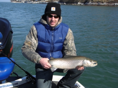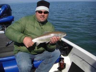 First thing I noticed was the decent water color, but more importantly the water temperature was a few degrees warmer than last week. So, hopes were high! We casted spoons and stickbaits down the shoreline with no hits or follows. I made the decision to start trolling. We put out a few small in-line boards and a couple of flat lines and down the shore we headed. Right as we got into the cove East of Shipbuilders creek FISH ON! IT was our first fish of the day and it was our smallest fish of the day. We trolled a little bit further without a hit, and I made the decision to head down to 4 mile creek. We pull up and the water still looks good. We found 37 degree water outside the mouth and once in the creek it was 38. Not a touch, which was really surprising. So, again the decision to troll was tossed out and accepted by the crew. We put the lines in the water and headed back West. From 4 mile creek to shipbuilders we were able to put 5 more fish in the boat, and we also lost one. It was a great end to a slow start! Black and silver off brand stickbait was the hot bait for us pulling 6 bites, and its brother in a goby pattern took one. Reports from some friends said they had as good or better luck trolling from sun up. Its starting guys, so gear up and lets go whack some fish!