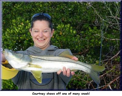 We settled on such a place and went to work. To my amazement, even in this place where the water had to squeeze down as if going through a funnel, the water movement was barely perceptible. With that said, it was also to my amazement that Jeff and Courtney caught five snook. We had at least killed the skunk.