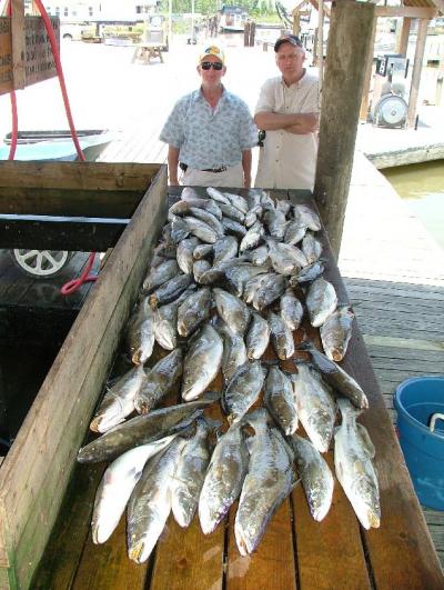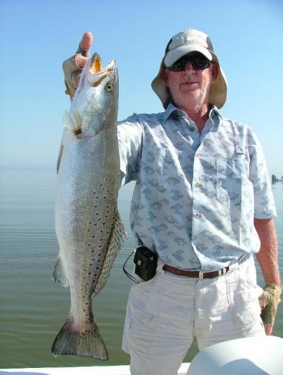 Got a report from Capt. Jeff on Saturday evening that he had found some GOOD fish late in the day. We decided to make an early run for some topwater action on Sunday morning. Arrived just as the sun was peaking over the horizon and immediately picked up some nice trout. I noticed that the trout were slapping at the bait more than actually trying to eat it, so we went sub surface. The Catch 5 was by far the best and we went to work on them. In the morning the fish were big females on a slow steady bite. After the tide turned the males went to work and it just went nuts! We already had a limit and threw back 50-60 in a little over an hour! Back at the dock, the trout we kept filled 6 GALLON BAGS! Now that is some THICK fish. Nearly every fish was over three pounds with 6 pounds being the biggest. Sunday was not the day to come in to Venice Marina with only a few fish as EVERYBODY had loads of HAMMERS. Several 8 pounders brought in over the last few days as well. Some FINE fishing down here in Venice right now!