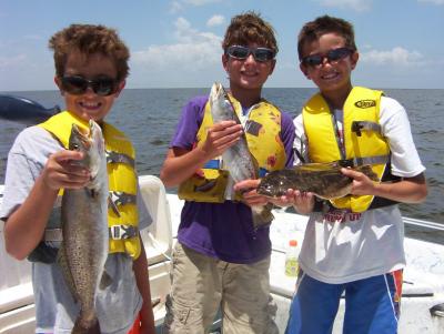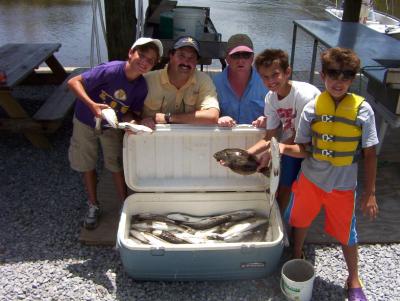 Lyman Thornton his sons Jacob and Bradley brought Justin Caulfield and his son Parker from Baton Rouge drove down to Hopedale this morning to get the boys on some fishing action before school started back up. Well that is just what they got. Right from the star these little guy's were having a blast catching trout. Lyman and Justin were in the action too. Then things slow a bit we moved around picking up a few at each stop then the last stop was the charm nice trout all 2 to 3 lb range were eating up. Croakers and shrimp under corks every cast. Finished up with an even 100 trout on ice and headed in around 1 pm before it got too hot.