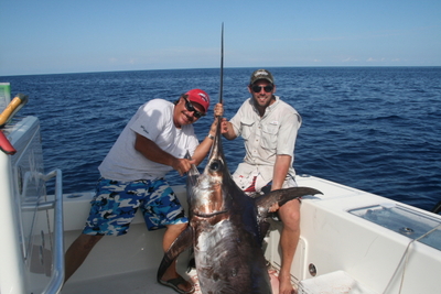 The new boat is truly awesome and she is already showing her luck. After I got her dialed in and got comfortable with the electronics, I have been busy chartering practically every day and without a doubt, she has already proven herself to be a true fish catching machine. We have now done 4 swordfish trips on the boat and have caught some very impressive fish. Last week I had an Australian customer who had pretty much fish around the world. He wanted to catch a swordfish and had booked a couple of days with me. The first day started with a decent bite that we managed to miss, followed by another bite that we got tight on but pulled the hook. The third drop was the charm and he successfully landed a beautiful sword. The short length on the fish was 80 inches with a 56 inch girth. The formula for weight (Length X Girth X Girth / 800) put her at 314 pounds. The angler fought the fish pretty much the whole time and only used the electric portion of the reel to retrieve the weight between drops. We were scheduled to fish into the night but a real nasty thunderstorm blew through so we headed back to the dock just before dark. The next day proved even better as he caught another sword, but this one was bigger. The formula weight put her at 422 pounds and it showed in the way she fought. While we do get some swordfish to jump, the ones that do, usually just get half their body out of water and most often only the head and bill get out of water as they slash the surface showing off their massive bill. This fish decided that it must be the cousin of a blue marlin, because it went completely airborne and did somersaults all over the ocean. If there ever was a time to have a video camera, it was that day. BTW, soon I will have a GoPro camera and will have it mounted to the tower so we are not going to miss shots like that again. This fish was definitely a fighter and wore my angler out and wore me out (mostly nerves) as I had to maneuver the boat so many times to keep her out of the pros. I don't know if these fish go to some kind of school, but they all certainly know where the props are on a boat. With some luck and good angling we got her. We also went day swordfishing today with a very good customer of mine who has caught quite a few sailfish with me. It was our first time swordfishing together. Our first drop we caught a small swordfish that we released and our second drop we caught a beautiful lit up sword of about 150 pounds. As we were making the attempt to drop again, the lightning and thunder from a massive quick brewing thunderstorm was enough for us to hed back into the edge and target other fish.