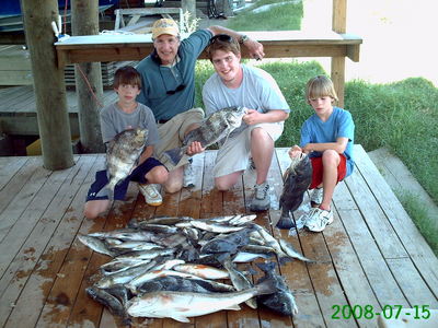 Tuesday from the Beach. Onboard were Mark Livaudais brought his sons Charley and Robert along with his nephew Will. As we pulled out we were greeted by a stiff North West wind. We made a couple of stops in Eloi, but could not get much going in the rough dirty water. We moved over to the other side of the MRGO and got on several fast Trout bites, but lots of small fish. We got on one good bite of decent Trout that was cut short by Flipper. The porpoise moved in to get in on the Trout action too. One even came about a 2' behind the boat, stuck his head up and looked at us. The guys asked about catching some Reds so we went looking for some. We found lots of under sized rat reds, but the guys also did get a few keepers and some Drum too. They had a great time and I look forward to seeing them again come October. Total take home for the day was 50 Trout, 3 Reds, 5 Drum, and 4 Sheepshead.