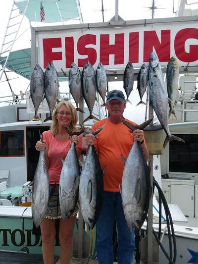 I decided to do some kite fishing because we had steady wind and a dozen live Goggle Eyes for bait. We went out to 180 ft. of water and put up two kites with 2 live Goggle Eyes from each kite. Red hot Tuna action began. We had an explosion on the baits, and were hooked up with 15 to 20 pound Tunas for the remainder of the trip. Everyone had a super time hauling in their Tunas – some were smaller than others but they will still cook on the grill very nicely.