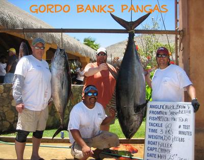 Keith Maurer's group from New Jersey was fishing on Monday with La Playita skipper Chame Pino when they first caught a 90 pound class tuna, which there were very pleased with and rightfully so. This proved to be just a warm up, the next fish they hooked into really tested their endurance, after a three hour marathon battle on stout sixty pound tackle they finally brought to gaff a monster cow sized yellowfin tuna of 250 pounds. This cow had hit on a live jack, which was being soaking underneath a large bait ball. Massive bait schools are now spread throughout the area and things are really shaping up to bust wide open. The fish are here now, a little finicky at times, no huge numbers, but quality is definitely there for the taking, would not be surprised to see the season's first 300 pound super cow be brought in to the La Playita weigh stations in the near future. Most everyday now we have been seeing yellowfin to 80 or 100 pounds, other monsters have been hooked and lost. There are still more tuna of 15 to 30 pounds being hooked on the sardinas, while the best chance of hooking into a cow has been on larger live baits.