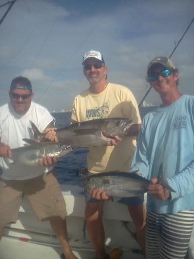 Fifteen minutes after leaving the dock lines were in the water at the sea buoy located in 120 ft. of water in Fort Lauderdale FL. We started off trolling with two plainers down, one with a purple and black sea witch in front of a double hook Ballyhoo and the other with a 3 ½ blue reflector drone spoon. For surface baits we went with two Ballyhoos and two Bonito strips with skirts in front and a daisy chain teaser. With 34 artificial wrecks located here in Fort Lauderdale FL, ranging from 60 ft. out to 430 ft. of water, gives you a wide area for fishing. I trolled over numerous artificial wrecks, the first sitting in 84 ft out, which is a DC4 airplane, the last sitting in 260 ft. of water, which is a 300 ft. freighter. While trolling, the anglers took turns catching fish, and we ended up with 9 Bonitos, a couple of Barracudas and 4 Tunas, the largest Tuna weighing 22 lbs.
