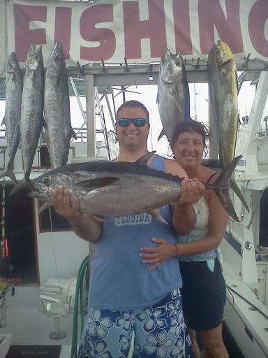 As we trolled over the reefs catching a couple of Bonitos and Kingfish, a color change was forming – a perfect avenue for fish to migrate through. With two kites up and two live Goggle Eyes from each kite, the action started. Our first strike was a Mahi Mahi from the right long kite weighing in at 15 lbs – Thea was the angler. The next few strikes were Kingfish – Ryan hooked up a total of 5 Kingfish, he brought in 3 weighing between 10-20 lbs, but two got away. From there we set up the kite again – this time an explosion occurred from the right short kite as water flew up. The line screamed and exited out of the reel at a very fast pace as the fish sounded - it was a good indication this was a Tuna. Twenty-five minutes later, Ryan brought the Tuna to the boat as Jackson, our mate, gaffed the Tuna weighing 29 lbs. From there, another tuna was caught weighing, 15 lbs.
