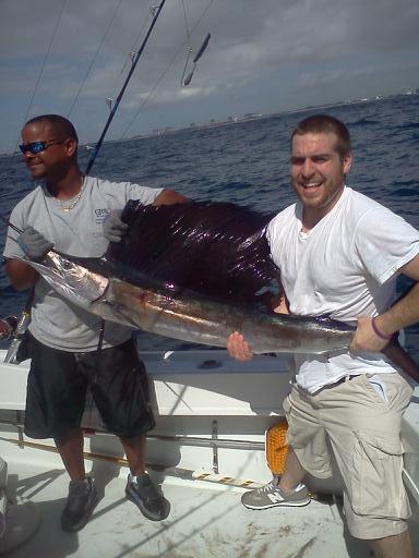 As I headed towards one of 34 artificial wrecks here in Fort Lauderdale, FL, our first strike came on the plainer rod which produced a nice size Bonito. Once I arrived at the artificial wreck in 265 ft. of water off of Fort Lauderdale, birds were working the area - a good sign of bait fish around and not too far off the predators. As we kept circling the wreck catching Bonitos and Tunas, a black shadow appeared on the left long rigger; dorsal and bill out of the water as he chased the trolling bait. Once hooked up, the Sailfish exited the water showing his magnificent neon colors and his powerful strength as he tail-walked away from the boat. Mike K was the angler, and as he did battle with the Sailfish, Jackson, our mate, and the other anglers reeled in the rest of the lines. Twenty-five minutes later, the Sailfish was in the boat for picture taking, measuring 87", and was released.