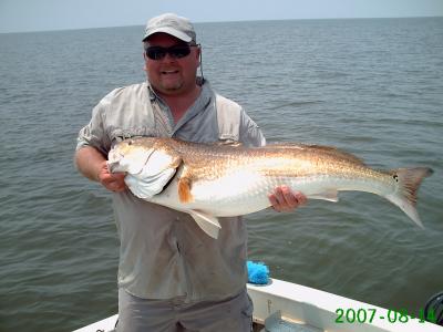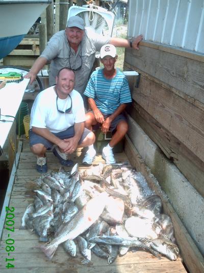 Two days of fun on the Beach with Mark Boykin, his Dad CW, and brother in law Allen. Tuesday morning we were greeted by perfect conditions. The wind was still, the water like glass and fish busting the surface. We started off a small wellhead in the Sound and the water was boiling with bait and fish. Some nice Trout were coming into the boat and even a few Trout and Reds were caught on top water. It did not take long for the Bull Reds to show up and CW hooked into a monster that put a smile on his face for the rest of the day. After they put over 40 Trout on ice the Sharks and Bulls got to be too much so off we went. We moved on over to a wellhead in Black Bay, but the tide was still. We tried our live shrimp from Campos every way you can, under a cork, on the bottom, and free lined, but only found a couple of catfish interested. I made a cast right under the rig with a Carolina rigged shrimp and immediately got nailed by a fat Trout. We then all switched to this and the Trout and Sheepshead were filling the box fast, and in no time limits were done. Total for day one was 100 Trout, 1 Red (many others released), 3 Spanish, and 8 Sheepshead.