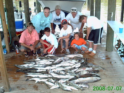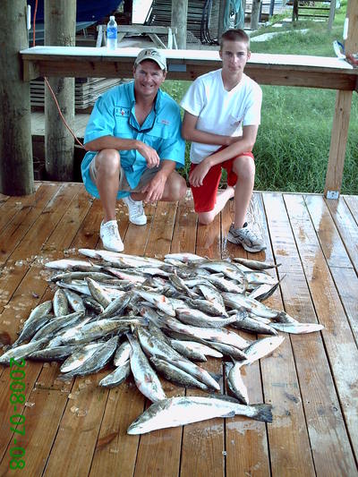 On Tuesday I had the same crew. They had to leave early so we had to stay close and go for numbers instead of size. We started out in Eloi and got on some good sized Trout at our first stop. The action got slow so we moved on and got on a fast bite, but lots of throwbacks to weed through. With time running short we left for another rig and got on a good bite of some better Trout and had to leave them biting so we could get back in on time. All fish were caught on Campo's live shrimp under a cork. The guys had a great time and put 87 Trout on ice.