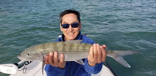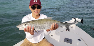 Two trips today with completely different goals which illustrates the need to stay flexible and ready as a guide in Miami. My morning trip was with Eric and his father in law Jim and Eric wanted to try bonefishing. Jim on the other hand wanted to relax and hang out plus of course catch a fish. With the wind building as the minutes went by I took them to a spot where the tide was perfect and got to work. Ha, it didn't take long as Eric hooks up and the fish is running so hard and fast into the wind I had to crank up the motor and follow it. When the fight was over a 12lb bonefish was in the landing net recovering before we took pictures of this beautiful fish. Wow, what a start! After release Eric tells Jim "your turn next." and it wasn't long until indeed Jim was on to another solid fish! This time I didn't have to give chase but it smoked the drag and then a 10lb bonefish was safely in the landing net. Geeze! We wrapped it up and fished other spots to get away from the increasing wind.