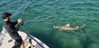 My afternoon trip was with regular client David and Nicole from N.Y. I had plans for snook and general crazy fish catching action but David wanted sharks. No problem, we caught bait and hit the flats. We saw one shark, a massive lemon that came by the boat, turned on the scent and ate one of the baits and the craziness was on! A long tough fight later the 200lb lemon was next to the boat and released. We hooked another big lemon but it broke off and finished the day hooking a massive nurse shark that spit the hook. .jpg)