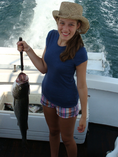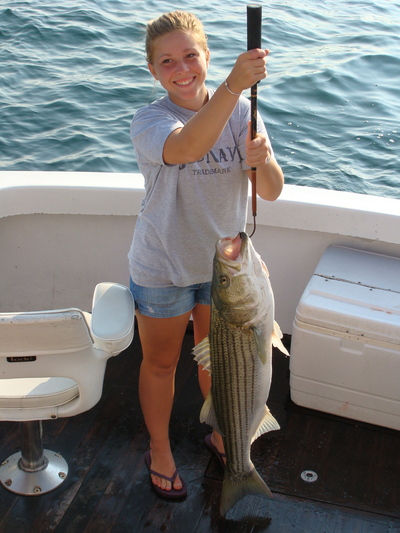 There were two young girls with the group, Emma Johnson 14 and Alissa Austin who is 13, and they had not done much fishing. Well, this has changed. Emma landed the biggest striper of the trip, 38 inches, and Alissa's fish was good size also. Alissa got treated to fishing behind the sea clammer and took a really nice fish on some really light gear. Two fisherpersons are born...