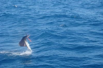 J.J. got everyone involved in helping clear all the other rods as Ken jumped in the chair and the fight was on. Here where things got really weird, this fish that ate the bottom bait was all over the surface and while I was looking into the sun I could see his BIG tail out of the water and slapping the surface. Than at first this fish was just coming toward the boat as if to see what was on the other end tugging on him. As he got closer I could see how his back was very dark while his belly was snow white with a very sharp edge divided the two.